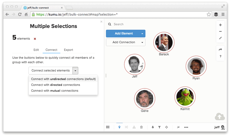 Say you have five friends that recently got together, and you want to connect each one to the others. That's 10 new connections to add (or 20 if you're using directed connections!). Although it's easy to add connections in Kumu, it would be easier if you could connect them all in one go.