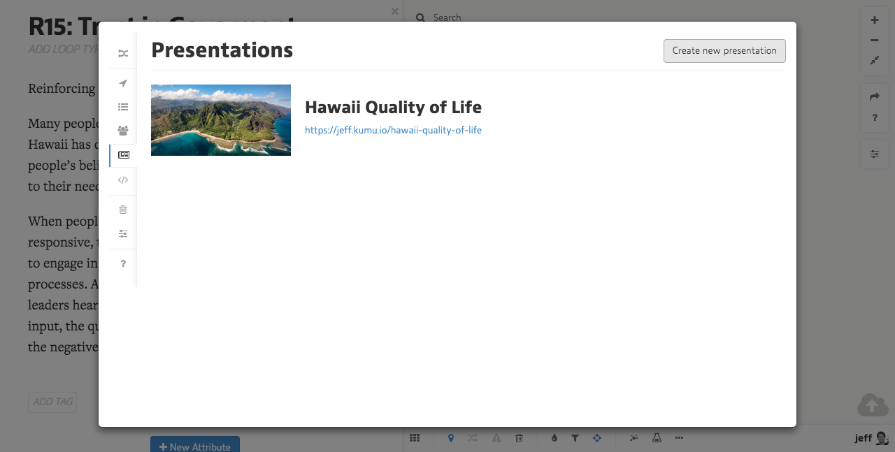 Presentations combine the best of PowerPoint, Prezi, and Kumu into one easy-to-use tool. Meet the single best way to communicate complex ideas with ease: