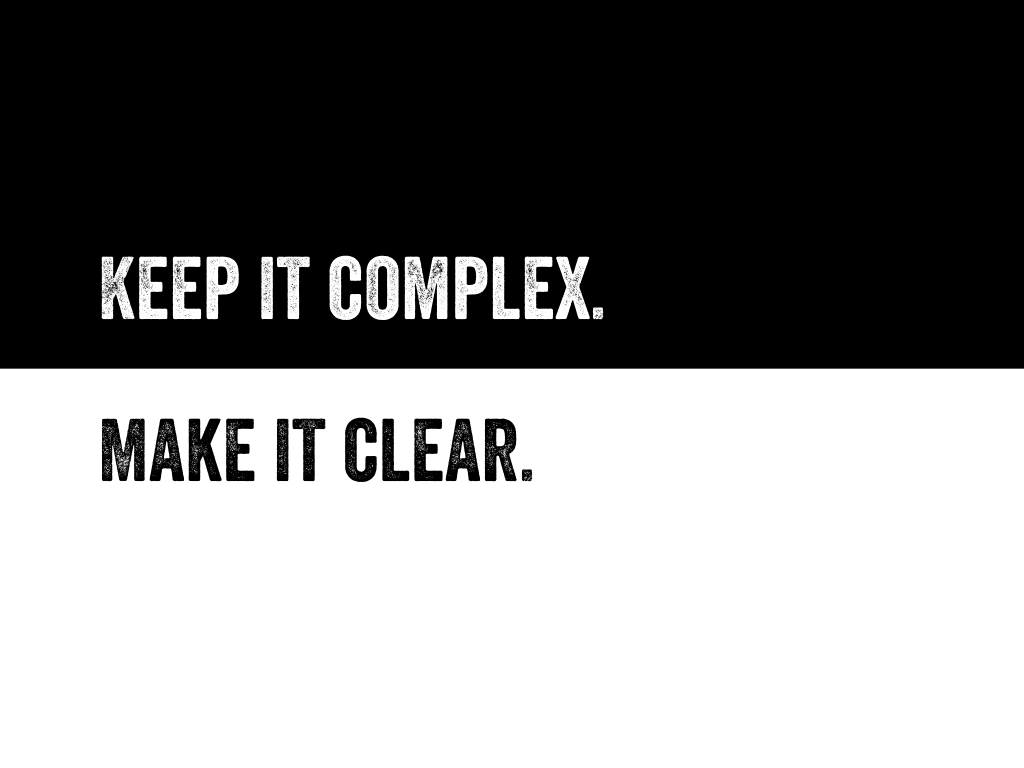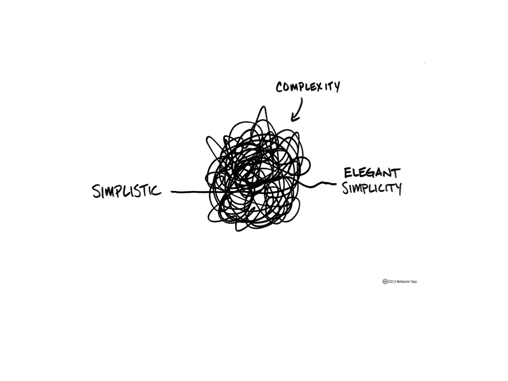 When faced with a complex challenge, it can be tempting to go with simplistic approaches - trusting your "gut" or essentially putting your head in the sand. Our goal should be to end up with elegant simplicity, where we've worked through the complexity enough to understand what we can leave out. What's great about this illustration is you can't just hop over the hairball in the middle. You have to follow that path, do the hard work, and then eventually end up at simple on the other side of complexity. And watch out for getting stuck in the middle - that's often the realm of academics and overwhelming, monstrous maps.