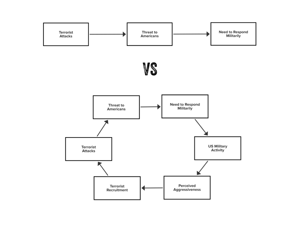 Our world is not linear, yet many of the mental models we use to make sense of the world are. Take these two explanations of terrorism and US response. You'll have a very different policy if your mental model is the linear version at the top, versus if you see terrorism as a dynamic feedback loop where US military activity is perpetuating the cycle. Whenever possible, look for loops as they are some of the most powerful forces driving behavior in systems.